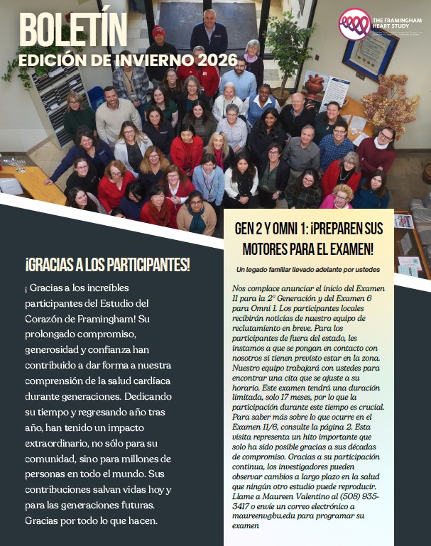 The Framingham Heart Study newsletter is produced once each year in the late winter or early spring. It is sent to the over 7,000 participants in the Heart Study all over the world and includes articles pertaining to current research, upcoming examination cycles, newsworthy past and upcoming events, and contact information of importance to our participants.